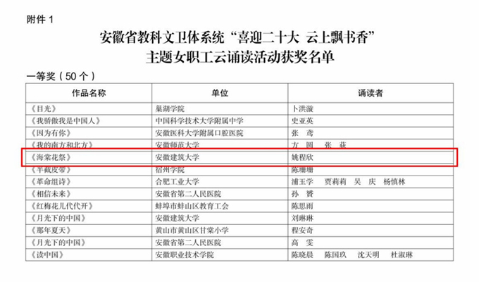 本网讯 为深入学习宣传贯彻习近平新时代中国特色社会主义思想,展示广大女职工的新时代风采和健康向上的精神风貌,营造喜迎二十大的浓厚氛围,省教科文卫体工会结合第27个“世界读书日”,开展“喜迎二十大 云上飘书香”主题女职工云诵读活动。建筑与规划学院姚程欣老师以《海棠花祭》荣获一等奖。