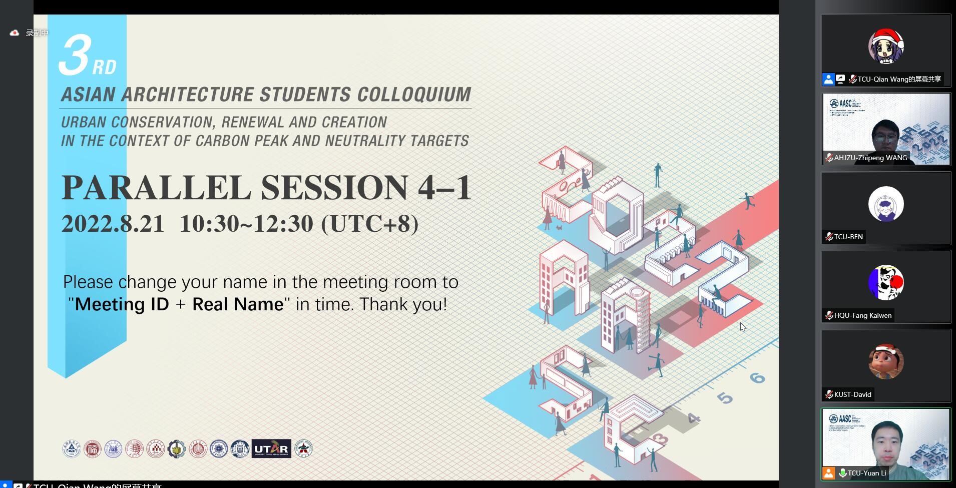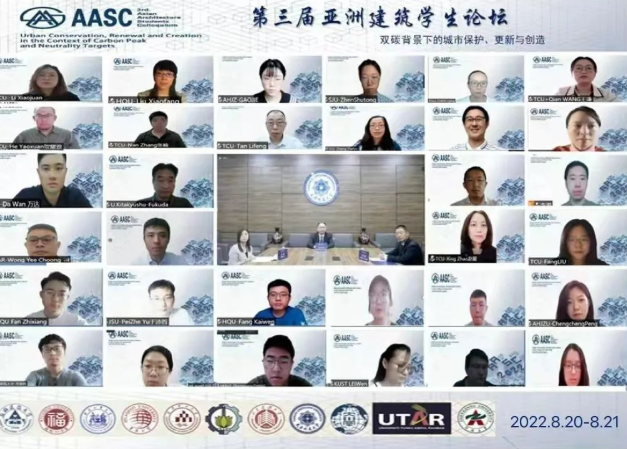 本网讯 8月20日-21日,2022年第三届亚洲建筑学生论坛(3rd.Asian Architecture Students Colloquium)在线上成功举行。本次论坛由天津城建大学主办、亚洲十余所高校协办,近150余名师生代表参加。我院王薇、周庆华、许杰青、王志鹏老师及11名研究生、本科生参加了本次论坛。