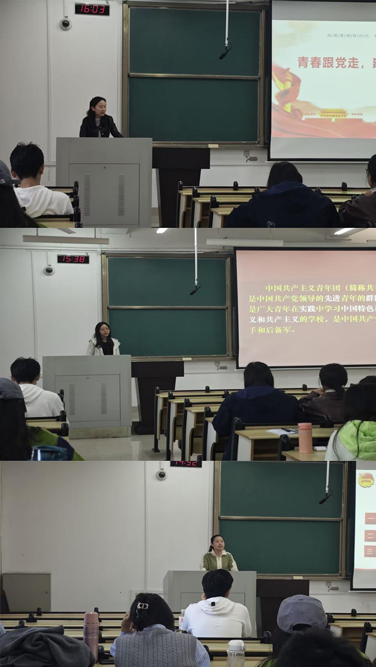 岳琦老师以中国共产党百年奋斗路的视频引入,视频展现了中国共产党带领中国人民从站起来、富起来、强起来的伟大转变。她强调,同学们要紧紧跟随中国共产党的脚步,积极向党组织靠拢,为实现中华民族的伟大复兴贡献力量。李芬老师授课的主题为《共产主义青年团章程》,通过讲解中国共产主义青年团的意义以及团员必须履行的义务等内容,使同学们进一步了解了中国共产主义青年团的基本知识以及新时代共青团员肩负的责任与义务。贾宇枝子老师讲述了共青团的历史,带领同学们了解共青团的诞生与成长,更加坚定了同学们积极向党组织靠拢的决心。