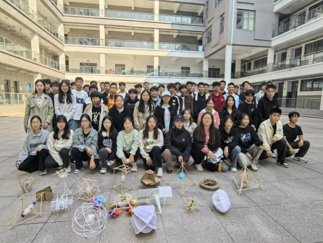 为了增强学生的学习兴趣和真实感知,课程的测试环节由学生亲自完成。在老师的组织下,学生们有序地进行了实验。一部分同学携带装置前往三楼进行测试,而另一部分同学则在楼下观察装置的落地情况,并记录下实验过程。测试进行过程中吸引了往来的老师与同学都驻足观看,测试结束后,老师对学生们的装置进行了最后的点评,学生们也对自己的设计进行了总结。在活动结束时,学生将场地打扫干净,展现了良好的团队精神和责任感。