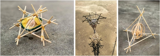 课题的核心挑战是设计一款装置,确保一只生鸡蛋从三层楼高度坠落后依然完好无损。学生们从最初的草图设计,到模型的成型,再到经过老师细致的点评和不断的模型完善与修改,最终形成了用于实验的模型。在设计过程中,学生对缓冲装置的特性有了更深入的认识,并探索了各种材料,以确保装置既能保护鸡蛋,又具有美观性。巧妙地运用了筷子、泡沫、瓦楞纸板、橡胶皮筋、绳子、木板等多种材料,设计作品形态各异、创意十足。