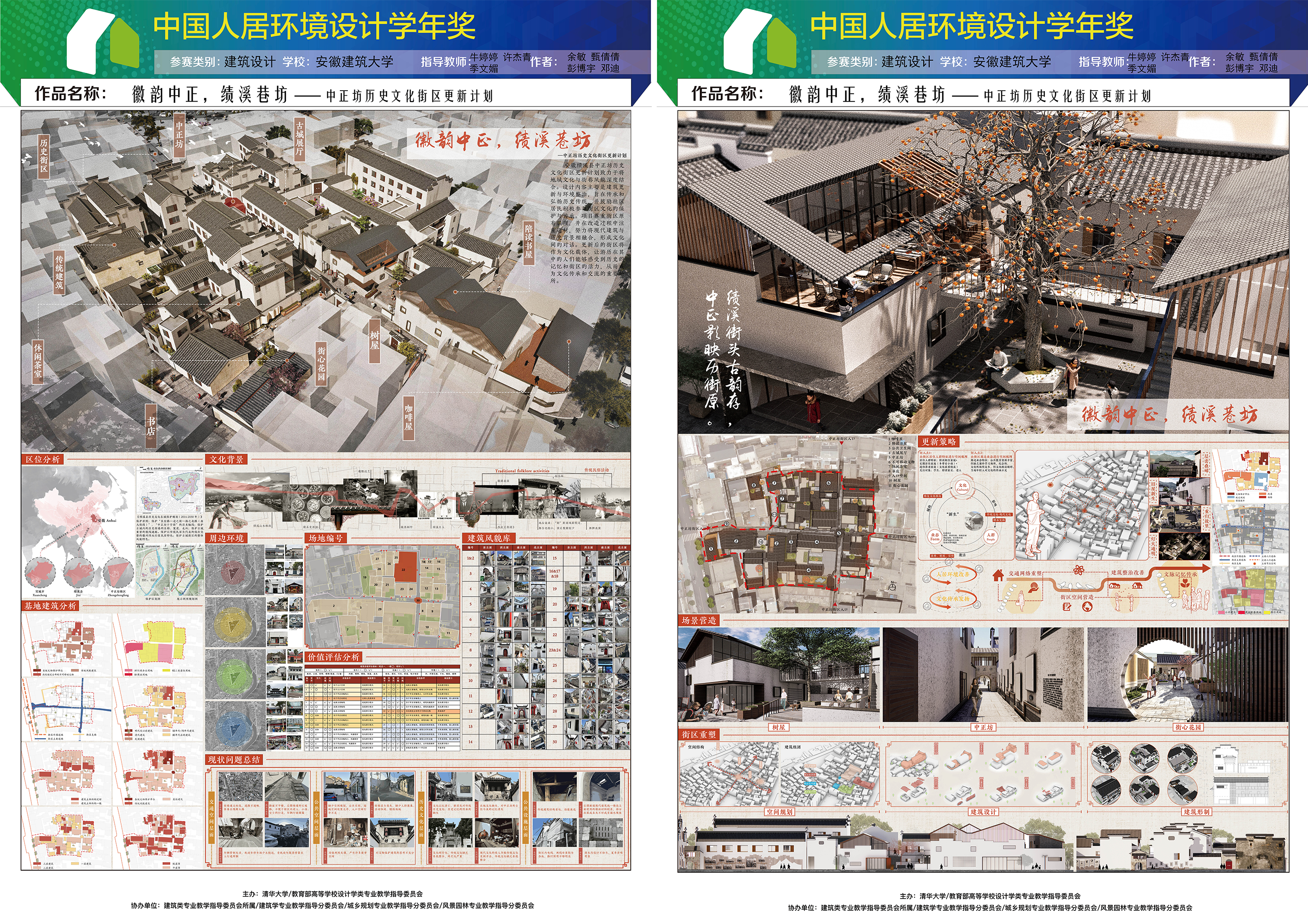 本网讯 近日,由清华大学与教育部高等学校设计学类专业教学指导委员会主办的“第十届中国人居环境设计学年奖”竞赛中,beat365在线唯一官网研究生余敏、甄倩倩、彭博宇、邓迪凭借作品《徽韵中正,绩溪巷坊——中正坊历史文化街区更新计划》荣获建筑设计组铜奖。