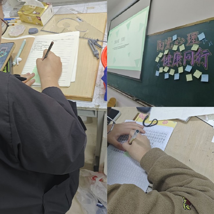 同学们回顾了入学的点点滴滴,在分发的小卡片写下自己的烦恼与希望,约定要互相帮助、共同成长,一起奔向美好的未来。同学们在回朔过程中,卸下周身疲劳和心中的压力与苦闷,全身心地投入到记录心情中去,此环节为同学们提供了一个非言语的表达渠道,让内心深处被压抑的情感得以释放。