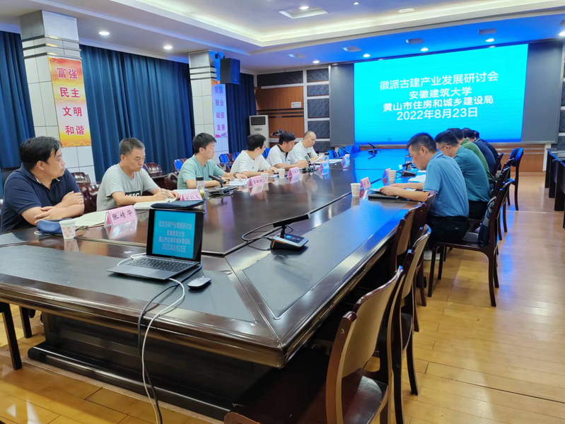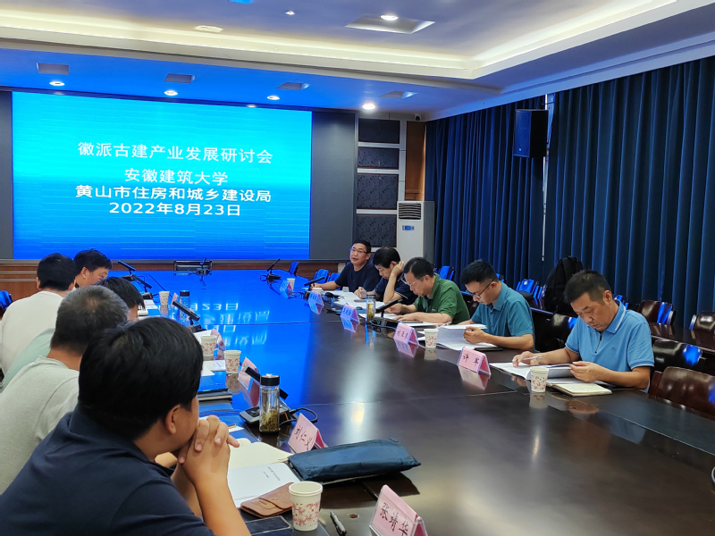 2022年8月23日,beat365在线唯一官网(徽派建筑安徽省重点实验室)和黄山市住房和城乡建设局联合组织在黄山市召开“徽派古建产业发展研讨会”。会议邀请了安徽省城市规划学会理事长吴晓勤、安徽省城建设计研究总院股份有限公司所长刘亚东、黄山市城市建筑勘察设计院院长陈继腾、黄山市徽派古建产业集团董事长许军、安徽省徽州古典园林建设有限公司总经理程忠平、黄山市住房和城乡建设局及徽派建筑安徽省重点实验室等相关人员共15人参加研讨。本次会议内容是配合第二届“黄山国际徽派古建产业发展大会 ”(以下简称产业发展大会)的前期研讨会。