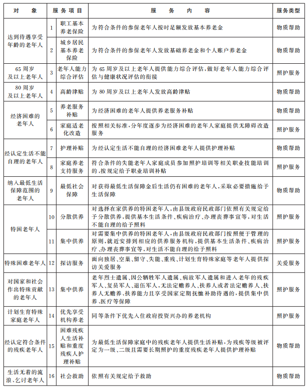 (二)主要任务。基本养老服务是指由国家直接提供或者通过一定方式支持相关主体向老年人提供的,旨在实现老有所养、老有所依必需的基础性、普惠性、兜底性服务,包括物质帮助、照护服务、关爱服务等内容。基本养老服务的对象、内容、标准等根据经济社会发展动态调整,“十四五”时期重点聚焦老年人面临家庭和个人难以应对的失能、残疾、无人照顾等困难时的基本养老服务需求。