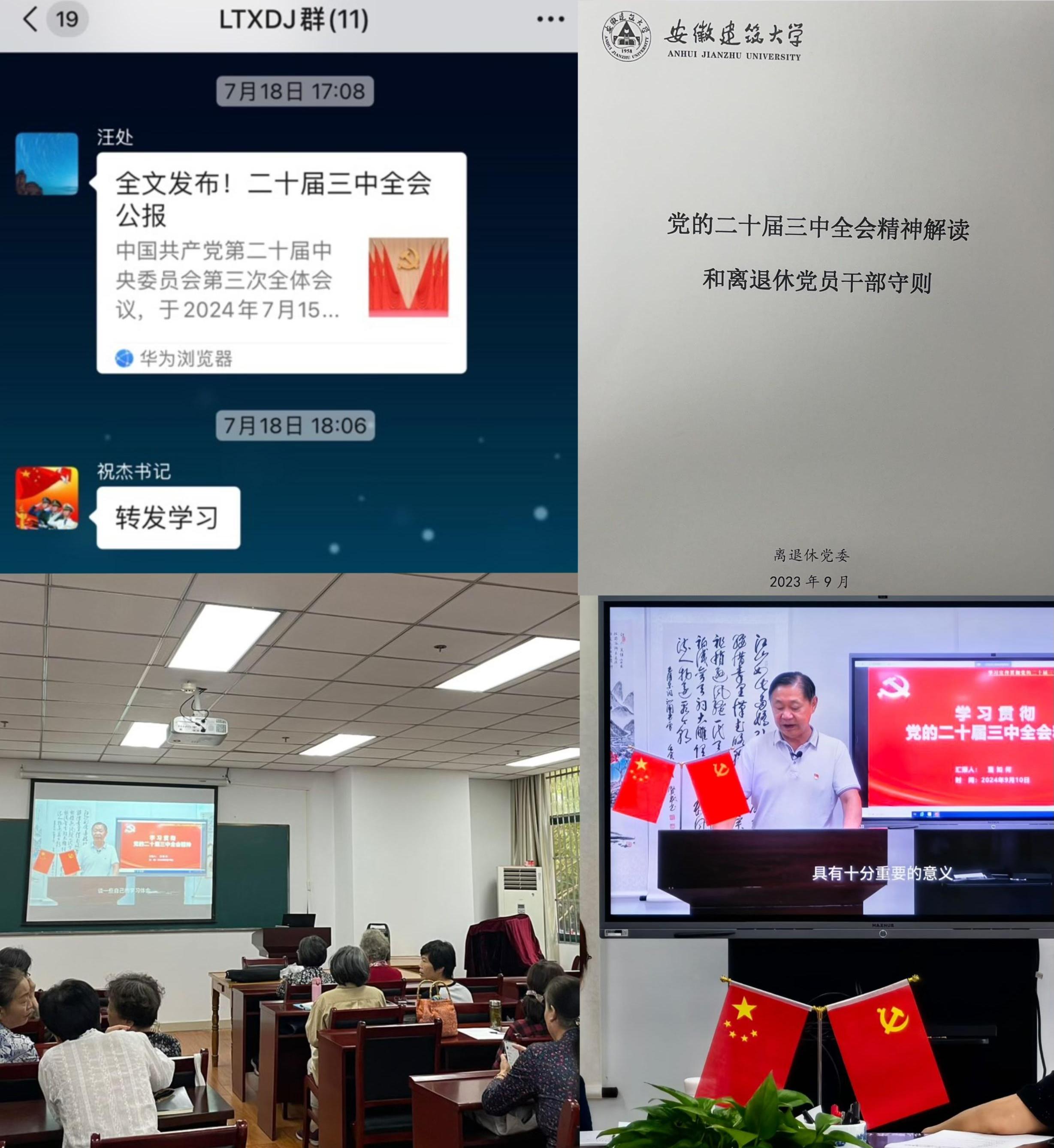 7月15日,党的二十届三中全会召开,离退休党委积极引导广大离退休党员干部收看大会盛况,并将党的二十届三中全会精神等学习资料及时发布在微信群。另外,离退休党委还通过老年大学课前播放微党课视频,发放党的二十届三中全会精神解读等学习资料,走访慰问送学上门等多种方式扩大学习覆盖面,引导离退休党员认真领会全会精神,坚定理想信念,深刻理解中国式现代化是强国建设、民族复兴的康庄大道。