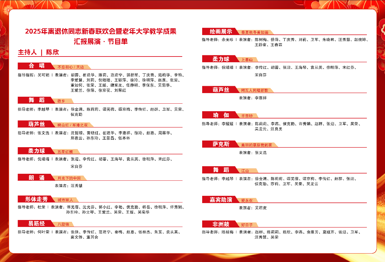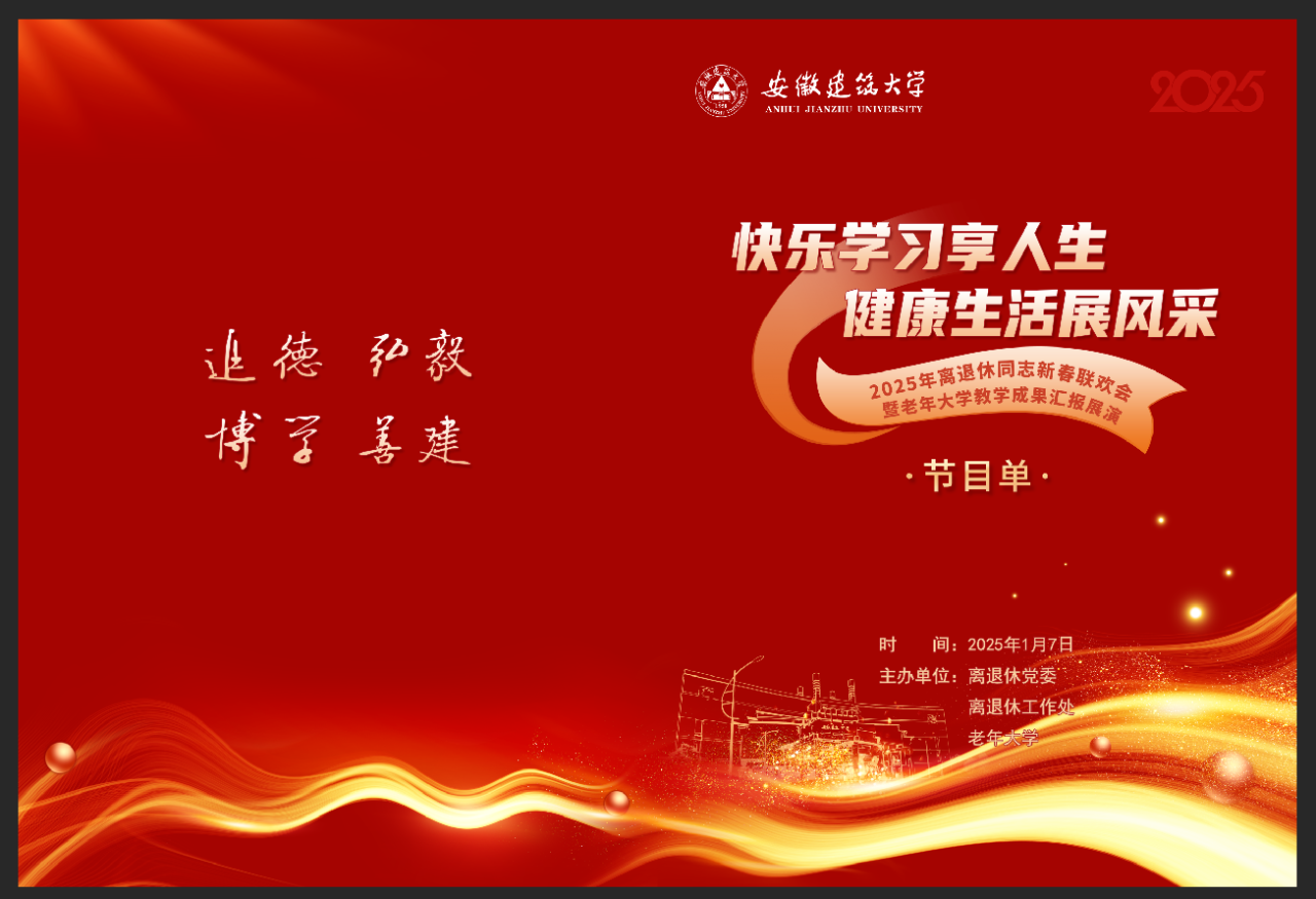 一元复始,万象更新。为增进离退休同志之间的交流,离退休工作处举办“快乐学习享人生 健康生活展风采”2025年新春联欢会暨老年大学教学成果汇报展演会,诚邀您前来观看!