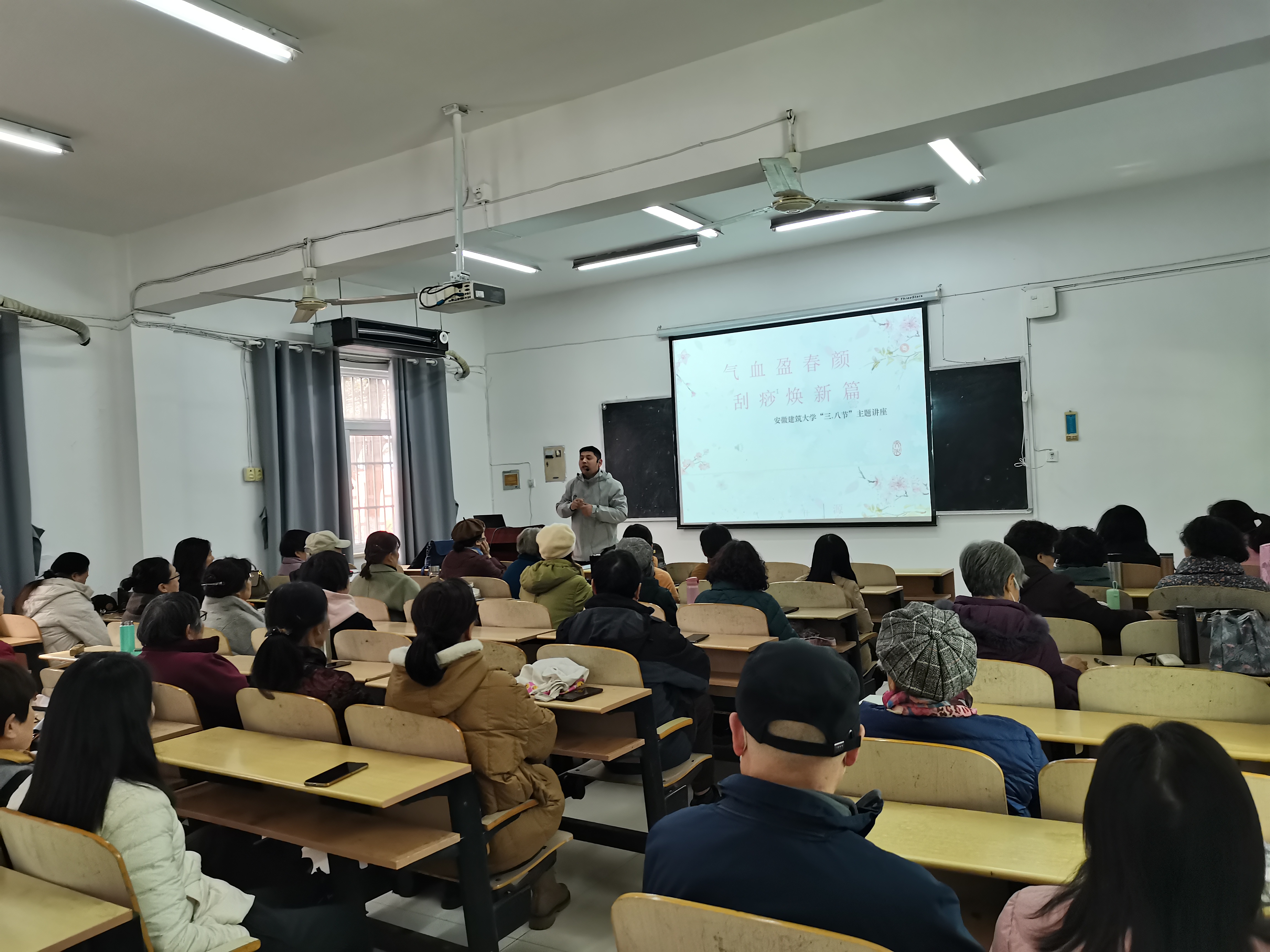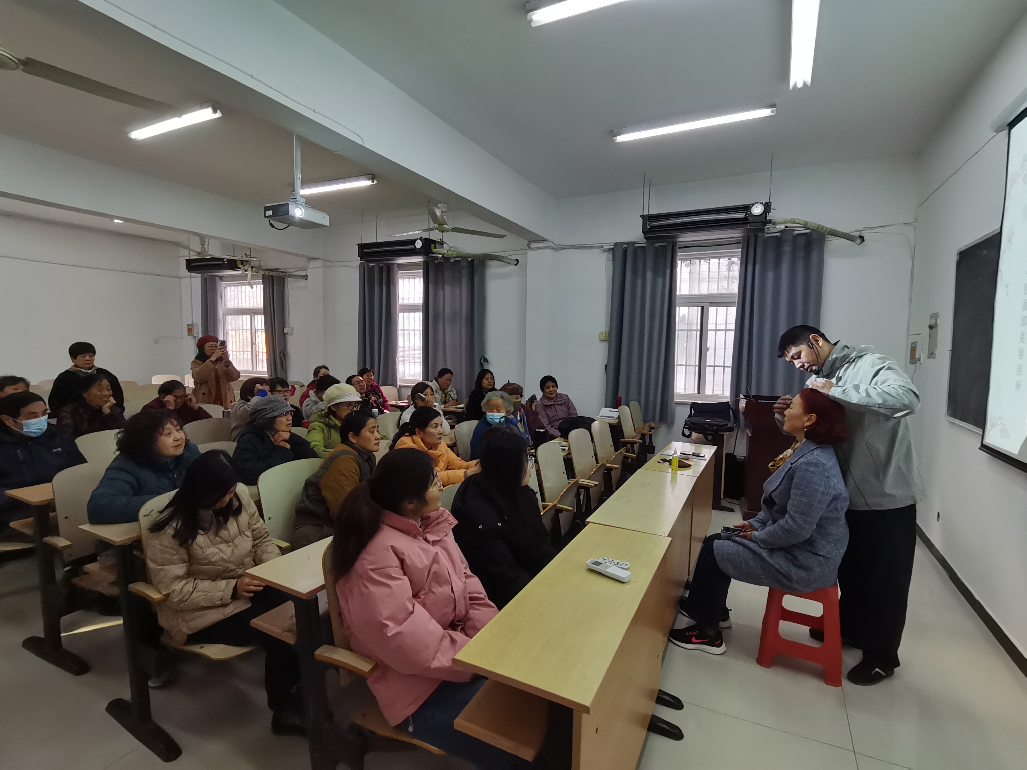 本网讯 为庆祝“三八”国际劳动妇女节,3月7日,学校老年大学特邀中医养生课程教师、中医康复理疗师、家庭保健按摩师考评员俞光明,为女性学员们带来了一场题为“女性面部气血养护”的专题讲座。讲座内容丰富,实用性强,深受学员们的欢迎。