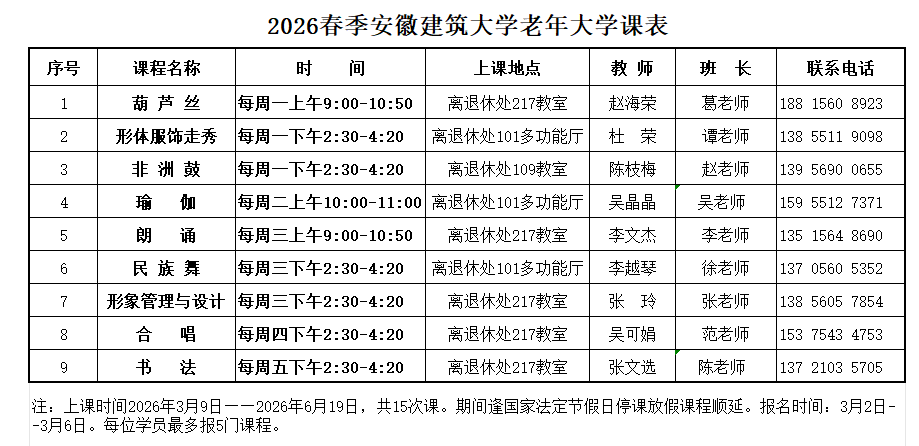一、老年大学2026年春季学期拟开设9个专业班级。因教学资源有限,每位学员限报5门课程。报名请微信 关注 服务号安建大离退休处 服务”-“校内人员登录入口。校内人员 登录账号即工资号 ,密码同 登录信息门户密码,如忘记,点忘记密码”,找回密码后登录,选择报名课程后,可在我的课表 ”中显示。本校退休人员家属请从校外人员登录入口进入。报名步骤请见附件。