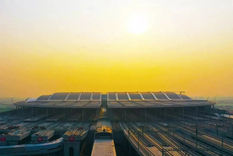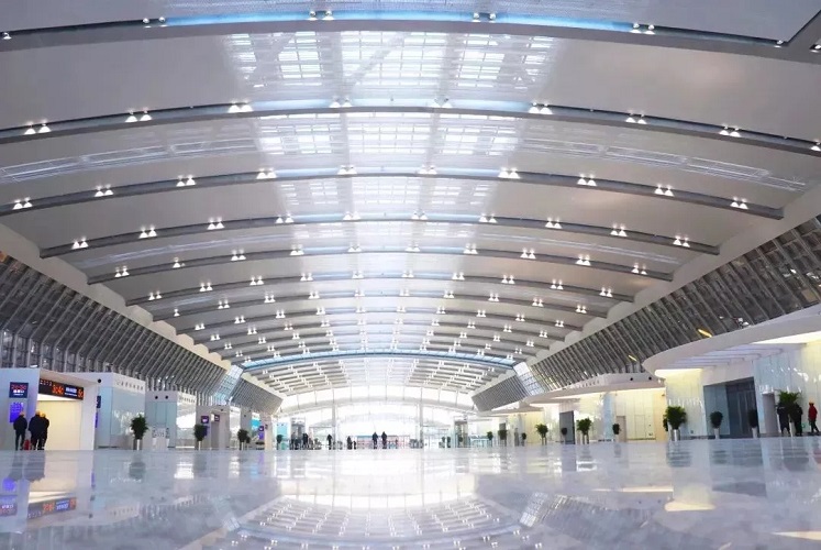 站房屋面系统总面积16万平方米,屋面铺设4.2万平方米光伏建材,其光伏发电可供站内照明,总容量6兆瓦,年节约标煤1800吨,减少二氧化碳排放4500吨,相当于植树12万公顷。