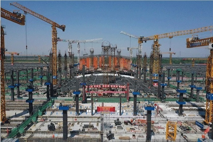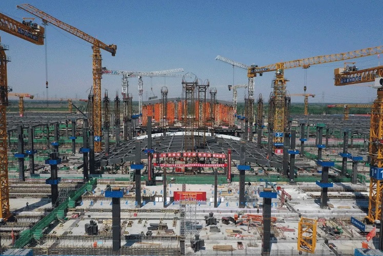 雄安站站房核心骨架为钢结构工程,工程总用钢量约13.1万吨,分段重量最大达33吨,采用高材质钢,钢板厚度最大可达80毫米,主要分布于轨道层及以下劲性结构,高架层钢结构、高架候车厅屋盖及雨棚结构等区域。