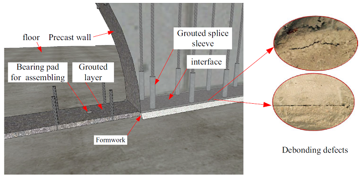 在装配结构中,预制混凝土竖向构件之间的灌浆层需要承受高轴向压力,并在地震中承受较大的剪力。界面处的脱层缺陷可能会显著降低结构的安全性能,由于灌浆层通常存在于狭窄的空间中,检查灌浆层的质量,尤其是检测界面处的脱层是一项比较困难的任务。针对这一问题,团队提出了一种基于冲击回波理论的界面脱层检测方法发明专利:ZL201711074920.8并通过数值模拟和试验及现场盲测验证了该方法的可靠性