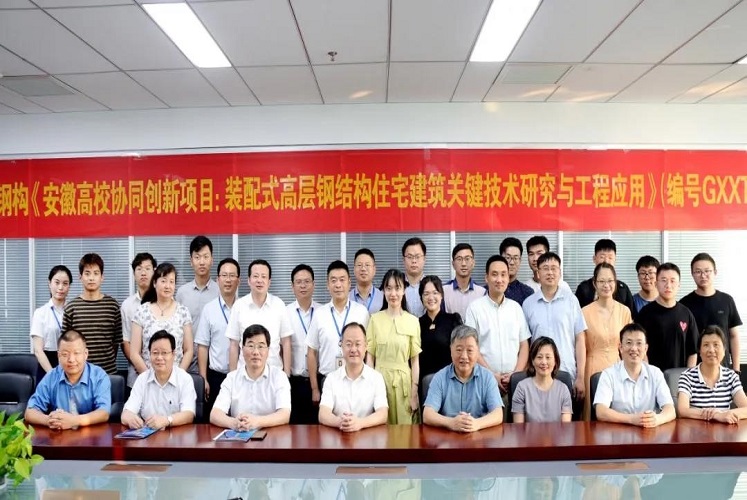 本网讯 8月2日,安徽省高校协同创新项目《装配式高层钢结构住宅建筑关键技术研究与工程应用》(编号:GXXT-2019-005)推进会在富煌钢构隆重召开。beat365在线唯一官网丁克伟副校长、崔建华教授、刘运林教授、合肥工业大学王静峰院长、完海鹰教授、安徽理工大学马芹永院长、安徽工业大学于峰教授、富煌钢构曹靖总裁、沈万玉副总裁等出席会议,共同总结课题最新研究进展、研究成果及下一步研究计划。