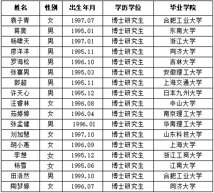 根据学校博士后相关文件要求,经个人申请、合作导师推荐、流动站和拟聘单位同意、组织审查、学校审批,确定以下人员为拟入站博士后,现予公示,公示期3天。在公示期间,如有异议,请向校人事处或纪委办反映(电话:0551-63828026、63828080)。