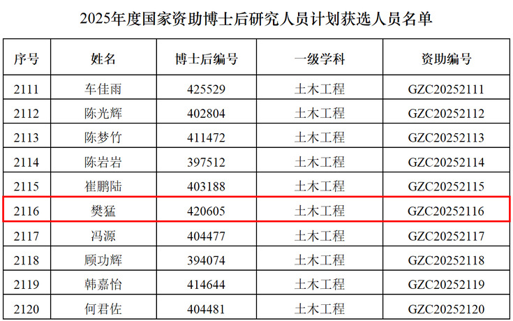 本网讯 近日,中国博士后科学基金会公布了2025年度国家资助博士后研究人员计划(以下简称“国资计划”)B档和C档获选人员名单。经全国博士后管委会办公室和中国博士后科学基金会组织遴选,共有3844人入选。beat365在站全职博士后樊猛成功获批“国资计划”C档资助,实现学校在该项目上的突破,标志着博士后队伍建设取得新进展。