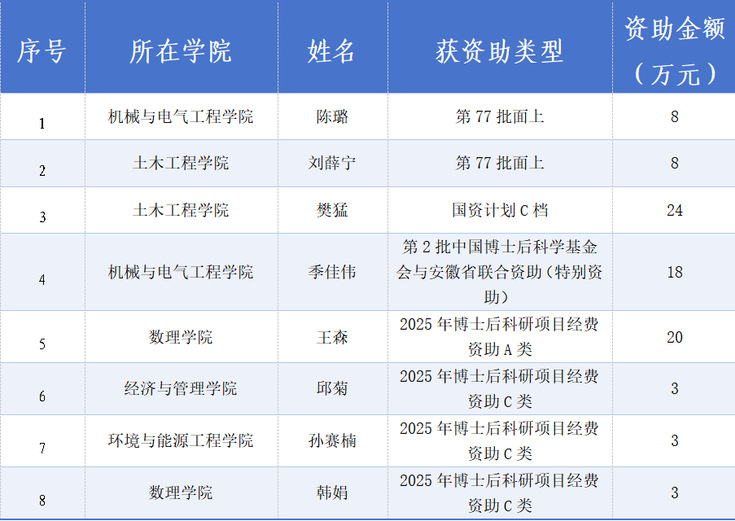 本网讯 近日,中国博士后科学基金会及相关部门陆续公布了2025年度各类博士后科研项目资助名单,beat365博士后表现出色,实现了多方面的突破,共获批国资计划C档1项、第77批面上资助2项、第2批中国博士后科学基金会与安徽省联合资助(特别资助)1项,另有4人获得省博士后研究人员科研项目资助,经费总额87万元。此次获批的数量和总金额均创历史新高,并在中国博士后科学基金面上项目、国家资助博士后研究人员计划方面取得了显著突破,体现了beat365博士后科研质量和水平整体跃升。