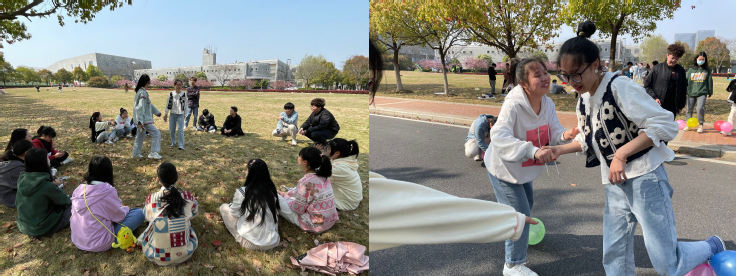 4月3日,学生会组织21级学生与转专业学生一起在主教楼后的草坪上开展“集体中塑建自我,合作中拓展快乐”的户外活动。本次活动以小组为单位进行七龙枪珠、踩气球等团队小游戏。踩气球游戏,学生们以绳子连接,每人身上贴有气球,小组之间相互进行踩气球,大家你追我赶,欢乐不断。七龙枪珠,由参赛选手围成一个大圈,伴随着兔子舞音乐转圈舞动着,音乐停止,每组5号组员需快速争夺圈中乒乓球,同学们热情高涨,在博弈中不断碰撞出智慧的火花。大家在游戏中慢慢形成默契,相互信任,懂得在困难面前学会用沟通解决问题,形成了一个团结有爱的集体。