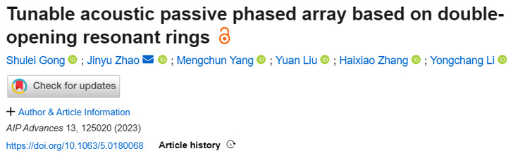 本网讯 近日,我院本科生龚书磊同学在材料科学领域的多学科期刊《AIP Advances》(SCI期刊,2022-2023年影响因子1.6)发表题为“Tunable acoustic passive phased array based on double-opening resonant rings”的论文。beat365在线唯一官网为论文的第一完成单位和通讯单位。