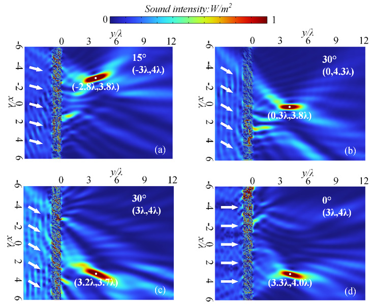本文设计了一种基于双开口谐振环的可调声学无源相控阵,它可以通过控制旋转角度对声波进行调制,弥补了普通超材料固定结构后无法更改的缺陷。旋转角度根据广义斯奈尔定律进行选择,不仅能在较大频率范围内实现聚焦功能,还能满足不同角度入射声波的聚焦需求,以及控制焦点的位置。