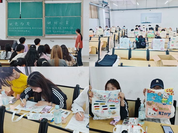 学院时刻关注学生特殊需求。为帮助学生缓解学业压力,激发内心的情感表达,学院推出“以包为笺,倾诉心言”帆布包彩绘 DIY 活动。活动中,同学们手持画笔,蘸取五彩颜料,全情投入创作。完成作品后,每个人都洋溢着满满的成就感。此次活动借助艺术疗愈的独特魅力,为学生的情绪释放打开一扇安全之门,同时也培养了他们的审美情趣与创新能力。