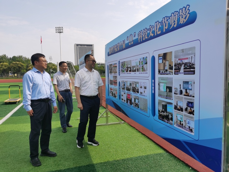 活动开始前,杨科来到数理学院第十届Ω科技文化节剪影展板前,饶有兴致地听完介绍后,对学院在科技创新、文化育人和人才培养方面取得的成果表示赞许。