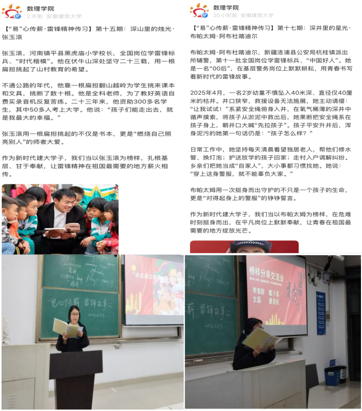本网讯 为深入学习贯彻习近平总书记关于弘扬雷锋精神的重要论述,引导广大青年学子深刻把握雷锋精神的时代内涵,数理学院精心策划并组织开展了“‘易’起学雷锋,青春向未来”主题教育系列活动。活动围绕“深学、引领、实践、涵养、创新”五个维度协同发力,推动雷锋精神在校园内落地生根、蔚然成风。