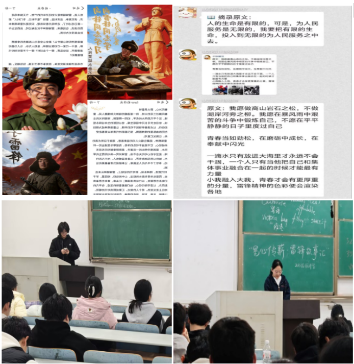 活动创新采取线上线下融合模式,扎实推进理论学习。线上推出“读雷锋日记·悟青春担当”主题打卡活动,引导学生通过摘抄原文、撰写心得、分享瞬间等方式记录所学所悟,着力营造“人人可学、处处可为”的浓厚氛围。线下依托班级、团支部,组织开展专题学习研讨与座谈交流。同学们结合自身学习经历与学生工作实际,积极分享对雷锋精神的理解与体会。大家在交流中碰撞思想、深化认识,在分享中凝聚共识、强化认同,进一步筑牢了传承雷锋精神、担当时代使命的青春信念。