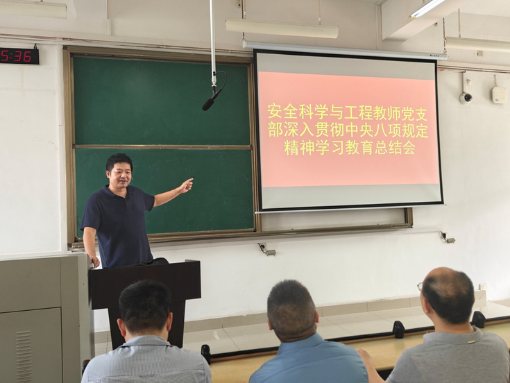 本网讯 2025年9月11号,在安全工程系新生专业教育会议后,安全科学与工程教师党支部召开了深入贯彻中央八项规定精神学习教育总结会。本次会议旨在回顾过去一段时间内支部在贯彻落实中央八项规定精神方面的工作成果,分析存在的问题与不足,并进一步明确今后的努力方向。