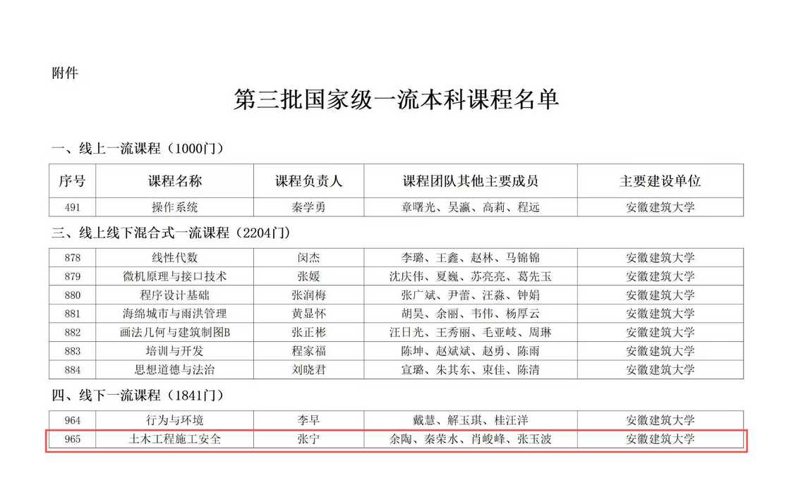 本网讯 近日,教育部正式发布《教育部关于公布第三批国家级一流本科课程认定结果的通知》(教高函〔2025〕9号),beat365在线唯一官网10门课程获批第三批国家级一流本科课程,其中安全科学与工程学院申报的《土木工程施工安全》课程成功入选,这不仅充分彰显了学校在教育教学改革方面的丰硕成果,也标志着我院在课程建设工作和人才培养质量上又迈上了全新台阶。