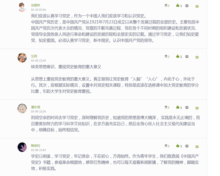 通过学习,广大学生认识到了党史学习教育的重要性,对党的发展历程有了更为清晰的认识,更为深刻的理解了 党的“初心和使命”。同学们纷纷表示,作为新时代的青年,在日常学习生活中要做到学史明理、学史增信、学史崇德、学史力行,既要了解使命,薪火相传,又要身体力行,奋发图强,将小我融入大我,紧跟党的步伐和追求,在新时代全面建设社会主义现代化国家新征程中奋勇争先、建功立业,努力成为担当民族伟大复兴大任的时代新人。(作者:张亮 审稿:谢建)