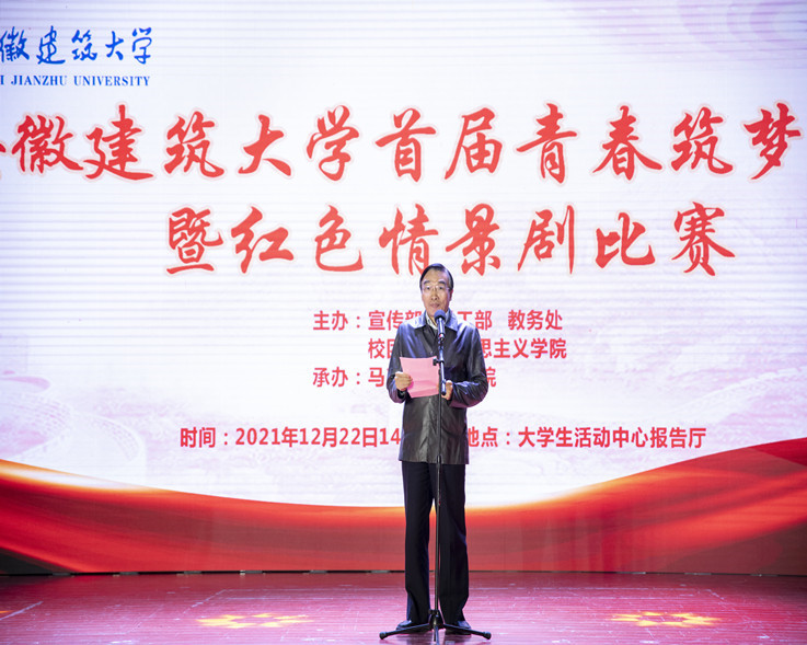 本网讯 2021年12月22日,beat365在线唯一官网青春筑梦剧场暨红色情景剧决赛在大学生活动中心正式举行。比赛采取线上线下同步直播互动的方式举行。校党委书记孙道胜致开幕辞,安徽农业大学马克思主义学院院长黄洪雷、安徽医科大学马克思主义学院院长柳泽民、合肥师范学院马克思主义学院院长吕明、校学生处处长、校团委副书记应邀担任本次比赛评委。宣传部、学生处、教务处、团委以及马克思主义学院等部门负责人出席活动。本次活动由宣传部、学工部、教务处、校团委和马克思主义学院联合主办、马克思主义学院承办。