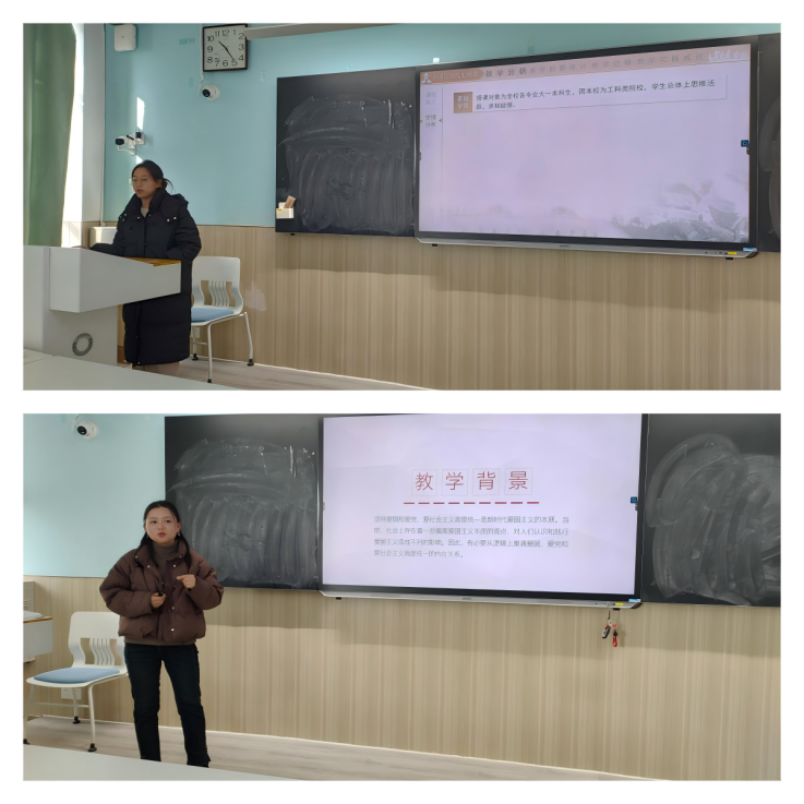 习近平新时代中国特色社会主义思想概论教研室的王景婷老师采取多元化的教学手段,从增强学习的自觉性、拓展思维的广度、培养创新的能力等关键维度入手,引导学生深入理解理论的背景、内涵和意义。原理教研室的周晨老师通过痛点分析,提出以OBE理念,重构教学内容、优化教学设计、创新教学方法,从“硬性灌输”向“问题导向”转变,使学生由被动“容器”向学习“主体”转变。毛概教研室的王亚洋老师通过运用多种教学方式方法把理论知识、情感浸润和行动实践层层递进、逐步提升,做到情理交融,引导学生不断增强对中国共产党和中国特色社会主义的认同。德法教研室的许畅畅老师采用叙事法、比较法、案例法,通过课前任务、课中任务互动、案例剖析等手段,引导广大青年学生勇担民族复兴重任,成就出彩人生。纲要教研室的万思贤老师基于知识图谱展开探究式教学,探索设计了“读-思-悟-融-通”五步混合式教学模式,依托原典史料实证、理性思辨、能力提升、榜样示范,提升“六感”构建了融贯的教学体系。