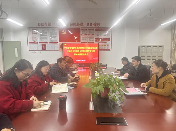 本网讯 在全省上下深入学习宣传贯彻二十届三中全会精神和习近平总书记考察安徽重要讲话精神之际,马克思主义学院积极探索新时代高校基层党建工作新思路、新模式,进一步推进“党建+业务”深度融合,12月26日,马克思主义学院中国近现代史纲要教研室教师党支部与安徽省委党史研究院(安徽省地方志研究院)科研规划处党支部共建签约仪式在学院举行。安徽省委党史研究院科研规划处处长、党支部书记顾永俊,副处长章慧丽,二级主任科员朱金龙,学院党总支书记李万银,党总支副书记、副院长刘晓君,“纲要”党支部支委及党员代表参加签字仪式。李万银主持共建签字仪式。