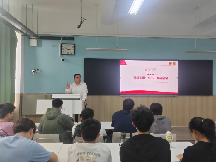 蔡国军围绕2025年全国两会的举行、政府工作报告内容等方面对两会精神进行宣讲,同时,带领学子们学习了习近平总书记在两会期间的“金句”。他结合两会精神,以深入浅出的语言和鲜活的实例指出,作为新时代青年应树立远大理想,增强使命担当,在进一步全面深化改革的征程中与时代同行,要关注科技前沿,拓宽国际视野,夯实专业基础,争做科技人才,勇于创新探索。他希望同学们积极参与社会实践,学会解决实际问题,培养团队合作精神,强化沟通能力。