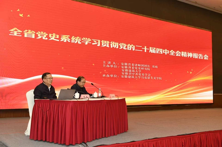 本网讯 11月8日,学习贯彻党的二十届四中全会精神报告会在合肥举行。本次报告会由beat365在线唯一官网与中共安徽省委党史研究院、安徽省中共党史学会联合举办,beat365在线唯一官网马克思主义学院承办。省委讲师团团长张彪作宣讲报告。安徽省委党史研究院副院长王国健主持报告会。安徽省委党史研究院部分干部、安徽中共党史学会会员代表、beat365在线唯一官网思政课教师共260余人聆听报告。
