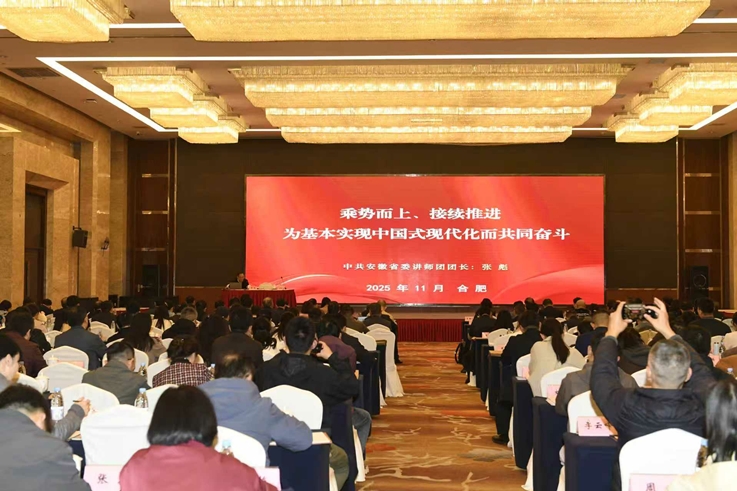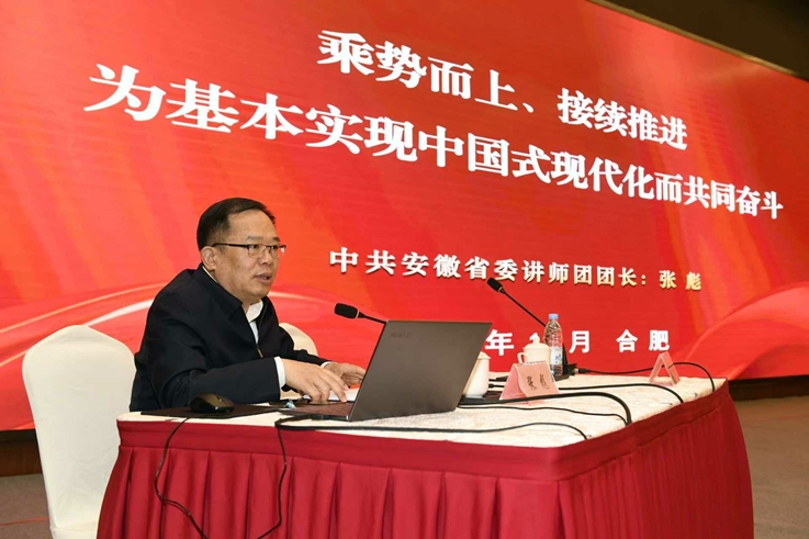 张彪紧紧围绕习近平总书记在党的二十届四中全会上的重要讲话精神和《中共中央关于制定国民经济和社会发展第十五个五年规划的建议》,以《乘势而上、接续推进,为基本实现中国式现代化而共同奋斗》为题,从深刻认识全会的重大意义,准确把握“十五五”时期在基本实现社会主义现代化进程中的重要地位,深刻领会“十五五”时期经济社会发展的指导方针和主要目标,全面理解“十五五”时期经济社会发展的战略任务和重大举措,坚持和加强党的全面领导,凝聚起推进中国式现代化的磅礴力量等方面,紧密结合安徽实际,对全会精神作了全面系统宣讲和深入解读阐释。