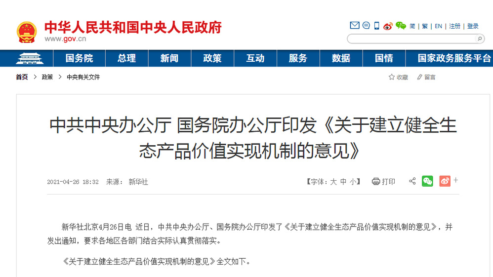 近日,中共中央办公厅、国务院办公厅印发了《关于建立健全生态产品价值实现机制的意见》,并发出通知,要求各地区各部门结合实际认真贯彻落实。