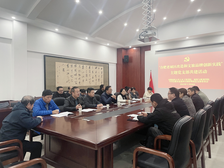本网讯 为深入学习贯彻习近平新时代中国特色社会主义思想,以共建促党建、以党建促发展,充分发挥基层党组织的战斗堡垒作用,11月29日下午, 土木学院建筑工程系、建规学院景观系教工党支部与合肥市逍遥津公园管理处下属支部开展以“合肥老城区改造和文旅品牌创新实践”为题的党建共建活动。土木工程学院党委书记王媛、建筑规划学院党委书记唐劲松、副书记吴梦东、建工系教工党支部和景观系的党员同志参加活动。逍遥津公园管理处书记胡从容及下属4个党支部的书记和党员参加了活动。