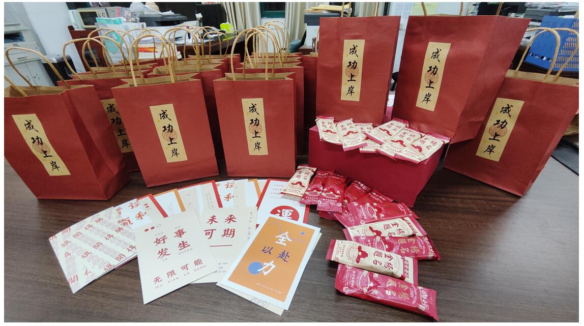 支部书记和党员代表在学生宿舍楼探望考研的同学,送上“助力福袋”,并提醒同学们考前准备、考研时间和考试细节等注意事项。贺卡上“愿你披荆斩棘、如愿以偿”、“此战必胜”等话语承载着党支部成员们满满的祝福,定胜糖上刻的“金榜题名”也汇聚着最美好的寓意。考研路上,党支部是同学们可靠的“战友”,也是温暖的“港湾”。