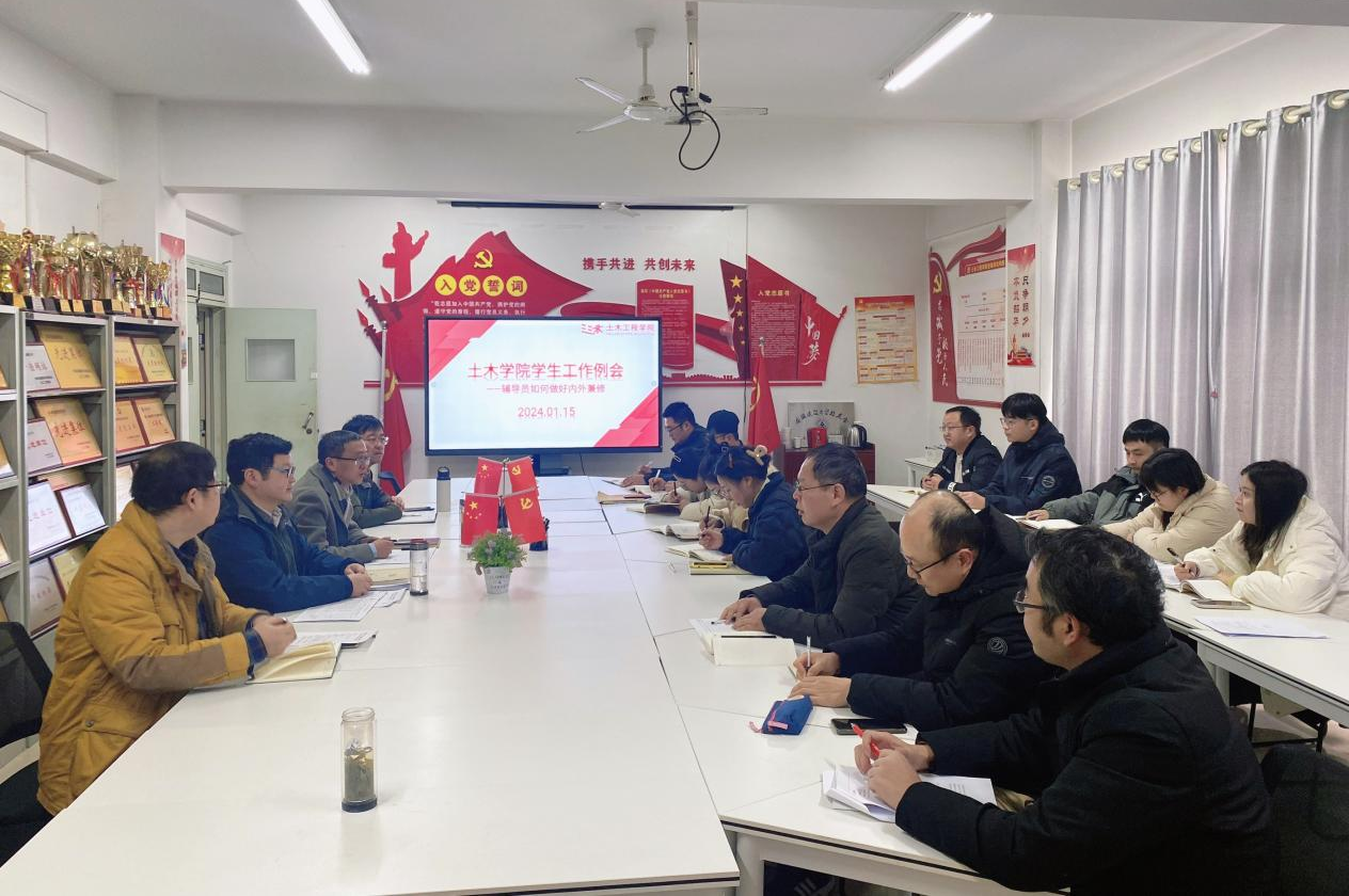 本网讯 为扎实做好期末学生工作,进一步总结凝炼、规划发展、统筹推进,努力做到“重点工作求突破,特色工作求提升,常规工作求精细”,1月15日,土木学院在徽匠楼1306会议室召开一月份学生工作例会,主要对2023年学生工作进行总结交流并部署2024年工作安排,学院领导班子、全体专兼职辅导员共同参会,会议由学院党委副书记马智鑫主持。