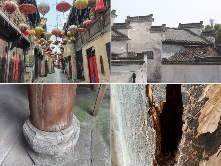 在棋盘村,团队探寻“棋盘布局”中北方营造技艺与徽州特色的融合密码,惋惜叙伦堂拆毁的遗憾,更坚定古建守护决心;黄田古镇“船形村落”的“天人合一”理念里,“四水归堂”天井的排水智慧、马头墙的防火功能,让成员们深刻体会古人与自然共生的建造哲学。从水东老街到黄田古镇,团队用脚步丈量12平方千米的古建群,记录下砖木结构缺陷、消防通道狭窄等30余项调研数据,为古建保护积累第一手资料。
