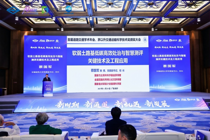 本网讯 2025年11月19日至21日,首届道路交通学术年会、茅以升交通运输科学技术奖颁奖大会在广西南宁顺利召开。在大会的开幕式上,隆重举行了“2024年度茅以升交通运输科学技术奖”颁奖典礼。蔡国军教授牵头申报的项目荣获茅以升交通运输科学技术奖特等奖。蔡国军教授应邀在大会上作了题为《软弱土路基低碳高效处治与智能测评关键技术及工程应用》的主旨报告。