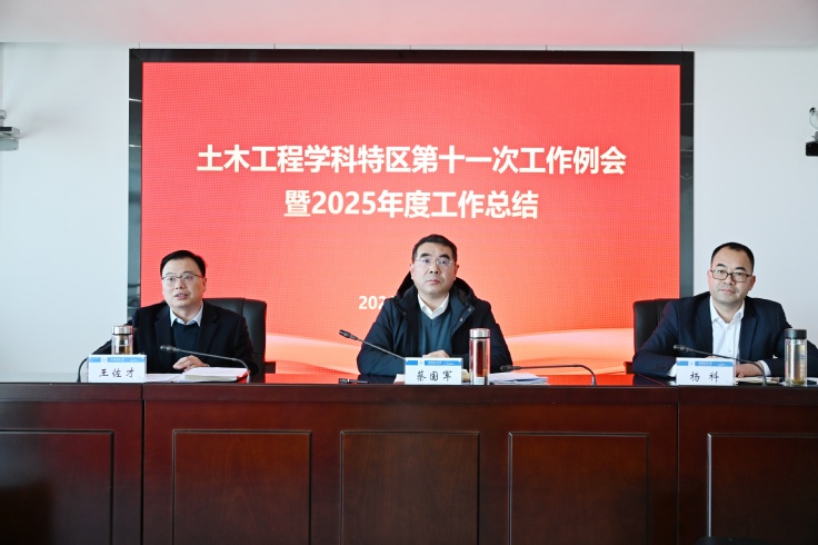 本网讯 2026年1月6日,土木工程学科特区第十一次工作例会暨2025年度工作总结会在徽风楼21楼第一会议室举行。会议由校党委副书记、校长蔡国军主持,校党委常委、副校长杨科,校党委常委、副校长王佐才出席。土木学院、环能学院、材化学院相关负责人以及学科特区骨干成员参会,共同总结2025年度学科特区建设成效,并对下一步发展任务进行谋划与部署。