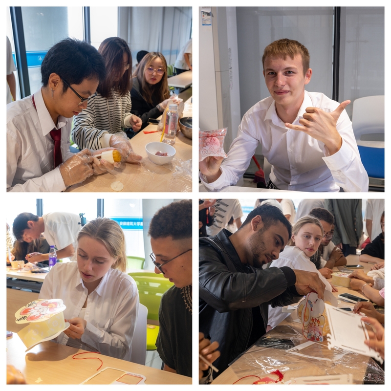 “入厨光夺霜,蒸釜气流液。揉搓细面尘,点缀胭脂迹。”这句出自清代诗人袁景澜的诗便把月饼的制作过程作了详细的描述。月饼象征着团圆,中秋节吃月饼寓意着团圆和家庭团聚。体验中国文化,感受中国魅力从亲手制作月饼开始。伴着金桂飘香,蒸冰皮、包馅儿、压花,中外师生自制了“秋天的第一块月饼”,既感受了中秋文化,又锻炼了语言交际能力。“一年逢好夜,万里见明时。”在月圆之夜,亲手制作的花灯象征着希望、以及对未来的美好期盼。花灯制作时,留学生们虽然不熟练,但是在大家的帮助下依然玩得不亦乐乎,每名留学生都用心组装着自己的花灯,制作出来的花灯有模有样,真正体验了一回“中国中秋文化”。
