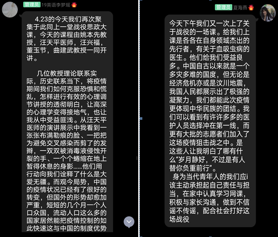 外国语学院严格按照学校的统一部署,辅导员加强宣传和组织管理,及时通知到每一位学生,组织学生通过直播和回看进行学习。收看结束后,外国语学院通过班级QQ群、今日校园等多种形式组织学生开展线上讨论。大家纷纷表示,此次“思政大课”主题鲜明,内容丰富,既有思想高度,又有理论深度。通过此次学习,增强了大学生听党话、跟党走的情感认同,也进一步坚定了战胜疫情的信心和坚决跟党走的决心。(作者:张中;审核:林莉兰)