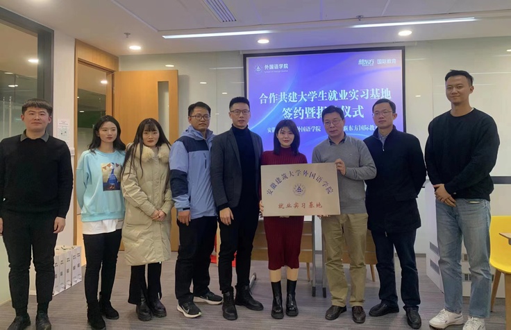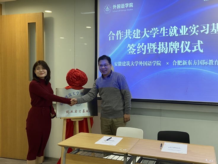 本网讯 12月1日下午,外国语学院院长徐春山、副院长张永军和辅导员一行,参观了新东方国际教育中心合肥分公司,洽谈合作事宜,并现场举行了合作协议签约暨挂牌仪式。
