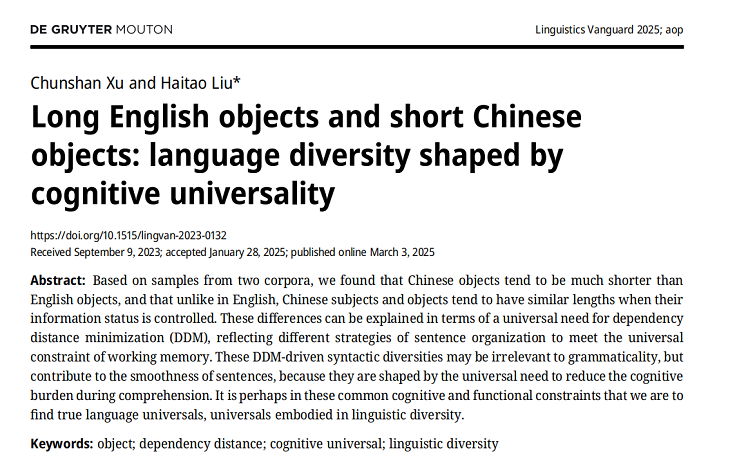 本网讯近日,我院徐春山教授的论文Long English objects and short Chinese objects: language diversity shaped by cognitive universality在SSCI二区期刊Linguistics Vanguard(语言前言)发表。该论文对汉语和英语的宾语进行了比较,探讨了语言普遍性和多样性的问题。