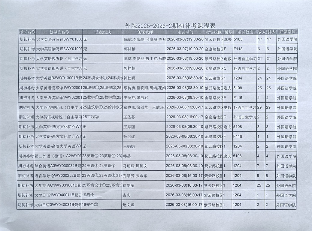 外院2025-2026-2期初补考课程表