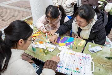 在这里,空白的书签卡纸成为了同学们表达自我的画布。活动现场准备了五彩斑斓的画笔、精致的流苏挂坠、干花以及各类装饰材料。同学们围坐在一起,发挥天马行空的想象力,用画笔描绘出心中的风景,用干花拼贴出自然的诗意。