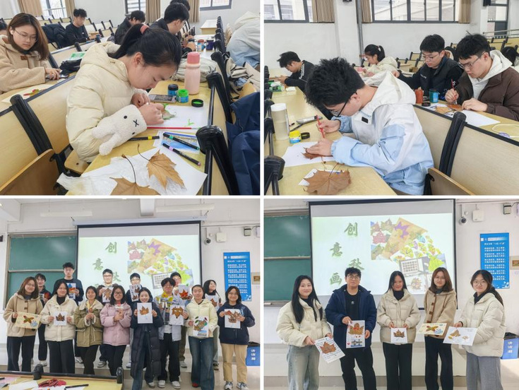 创意秋画活动中,同学们化身“自然创作者”,漫步校园捡拾各具韵味的落叶作为天然画布。大家将内心的情绪感悟、成长期望与生活故事凝于笔端,以色彩与线条为媒介,创作完成一幅幅独具个性的落叶画作。在与自然亲密联结的创作过程中,无声的艺术表达成为情绪宣泄的有效载体,让心灵在叶脉流转间得到温柔疗愈。